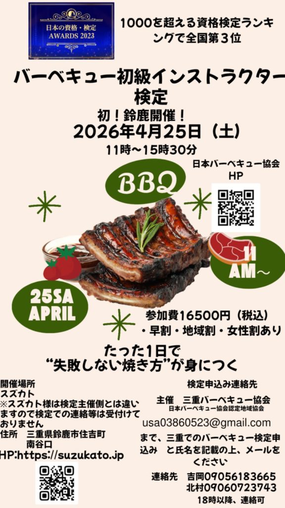 三重県【初級バーベキュー検定】4/25鈴鹿市にて開催!
