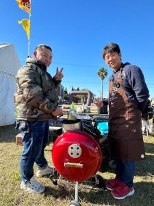 篠島産牡蠣の試食、櫓を使った塊肉スモークBBQの実演と提供