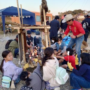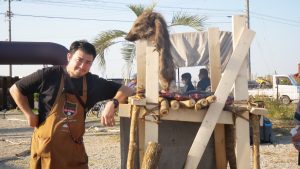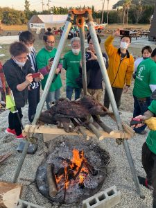 篠島産牡蠣の試食、櫓を使った塊肉スモークBBQの実演と提供