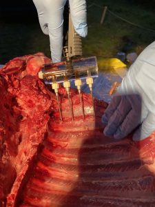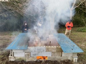 翌日の食事会に向けて、ノースキャロライナ式で一晩かけて焼き上げる「猪の丸焼き」の下処理と焼成工程にも参加いただきます。