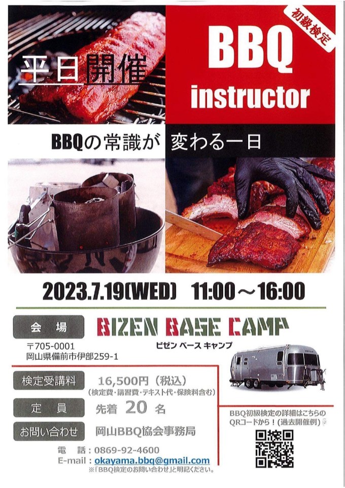 【延期 平日開催 初級BBQ検定】7月19日(水)岡山県